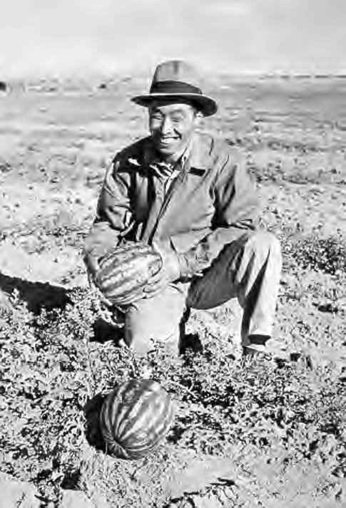 Eiichi Sakauye, agricultural statistician, holds the first harvested watermelon, Photographer Bud Aoyama, September 1943 (Ethel Ryan Collection #82.01.42.P)